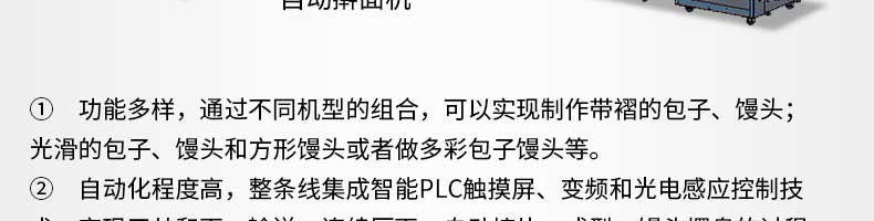 智能包子饅頭生產(chǎn)線,功能多樣,通過不同機(jī)型的組合,可以實現(xiàn)制作帶褶的包子、饅頭;光滑的包子、饅頭和方形饅頭或者做多彩包子饅頭等