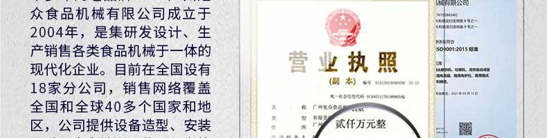 廣州旭眾食品機(jī)械有限公司是一家集科研開發(fā),生產(chǎn)設(shè)計,營銷服務(wù)為一體的現(xiàn)代化生產(chǎn)企業(yè)?,F(xiàn)代化生產(chǎn)車間,精湛制造技術(shù),所產(chǎn)機(jī)械歷經(jīng)市場重重考驗,不斷贏得海內(nèi)外客戶的贊譽(yù)。