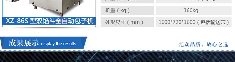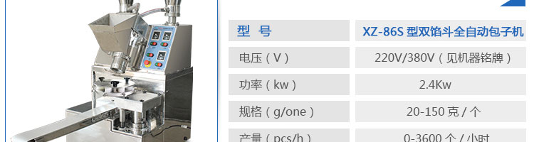 XZ-86S型雙餡斗全自動包子機,可生產(chǎn)各種肉包、肉菜包、菜包、小籠包、湯包、水晶包、圓饅頭、奶黃包、豆沙包、叉燒包、南瓜餅等幾十種包餡制品。適用于賓館、飯店、學(xué)校、機關(guān)企業(yè)食堂、饅頭或包子加工廠、早餐工程店及速凍食品廠等單位??蓾M足不同客戶群體。免費提供工藝技術(shù)。免費上門培訓(xùn)指導(dǎo)安裝。