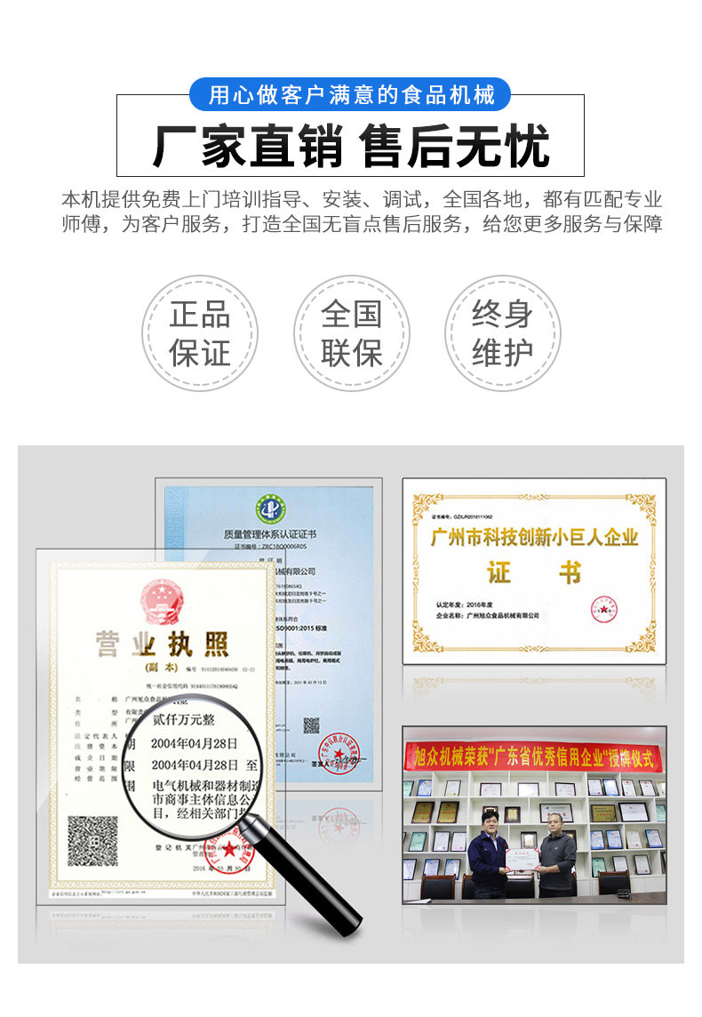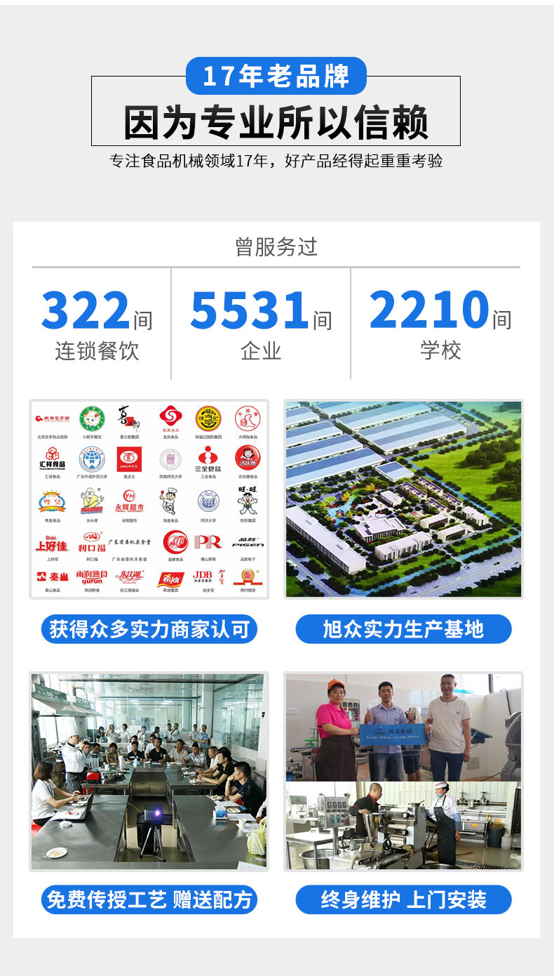 廣州旭眾食品機械有限公司是一家集科研開發(fā),生產設計,營銷服務為一體的現代化生產企業(yè)?,F代化生產車間,精湛制造技術,所產機械歷經市場重重考驗,不斷贏得海內外客戶的贊譽。