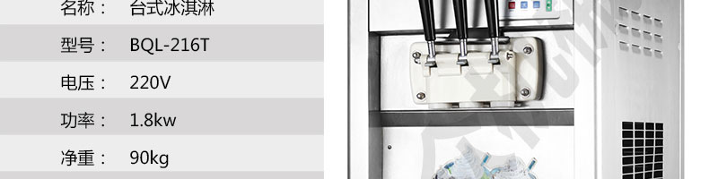 BQL-216T臺(tái)式冰淇淋機(jī),●選用國(guó)際名牌成熟制冷配套件和高效壓縮機(jī),融合旭眾精湛工藝輔以嚴(yán)格的質(zhì)量控制流程,使產(chǎn)品整體性能及品質(zhì)得以全面提升?!癫捎萌珨?shù)字電腦控制系統(tǒng),選用名牌優(yōu)質(zhì)電器元件,先進(jìn)的生產(chǎn)工藝,故障診斷,軟硬任意調(diào)制,自動(dòng)修復(fù)功能,安全精確,可靠性更高?!駥I(yè)成熟制冷系統(tǒng)設(shè)計(jì),選用世界名牌大功率專用壓縮機(jī),大大縮短冰淇淋成型時(shí)間,相同時(shí)間內(nèi)冰淇淋產(chǎn)量大幅度增加,使您生意火爆時(shí)依然得心應(yīng)手,為您創(chuàng)造財(cái)富?!癜踩椒€(wěn)的機(jī)械攪拌系統(tǒng),噪音更低、振動(dòng)更小,使整機(jī)運(yùn)行性能達(dá)到國(guó)際先進(jìn)水平?!翊_保進(jìn)料溫度在0°C~35°C;環(huán)境溫度5°C~40°C勻可正常使用。