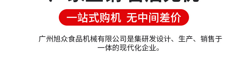 廣州旭眾食品機械有限公司是一家集科研開發(fā),生產(chǎn)設(shè)計,營銷服務(wù)為一體的現(xiàn)代化生產(chǎn)企業(yè)?,F(xiàn)代化生產(chǎn)車間,精湛制造技術(shù),所產(chǎn)機械歷經(jīng)市場重重考驗,不斷贏得海內(nèi)外客戶的贊譽。