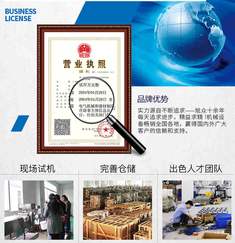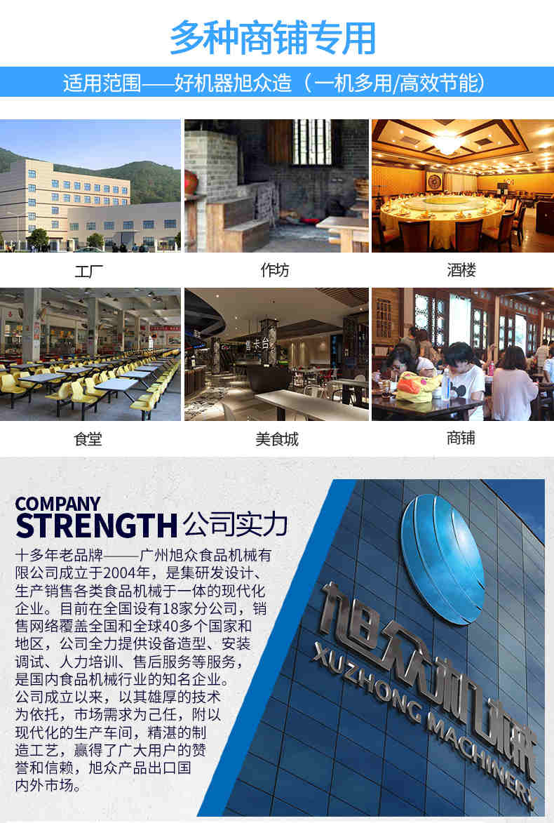 廣州旭眾食品機械有限公司是一家集科研開發(fā),生產設計,營銷服務為一體的現(xiàn)代化生產企業(yè)?,F(xiàn)代化生產車間,精湛制造技術,所產機械歷經市場重重考驗,不斷贏得海內外客戶的贊譽。