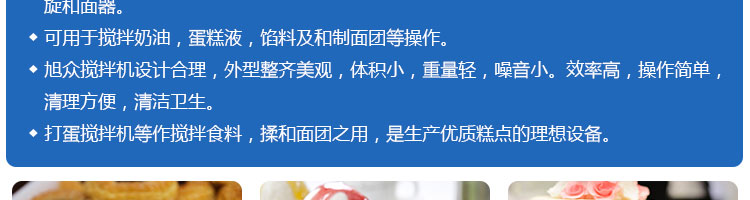 SZM10、15、20、25、30攪拌機(jī)系列,可用于攪拌奶油、蛋糕液、餡料及和制面團(tuán)等操作。打蛋攪拌機(jī)等作攪拌食料、揉和面團(tuán)之用,是生產(chǎn)優(yōu)質(zhì)糕點(diǎn)的理想設(shè)備,適用于酒店、飯店、學(xué)校部門、面包屋以及食品廠家。