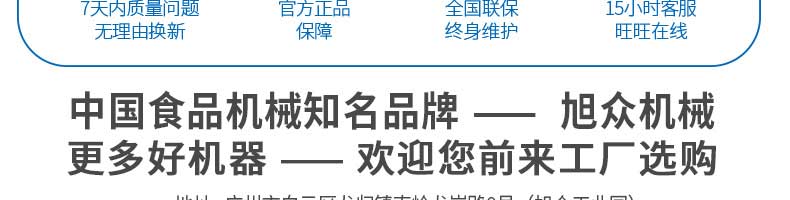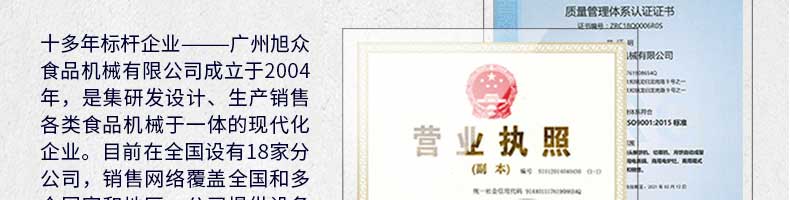 廣州旭眾食品機(jī)械有限公司是一家集科研開(kāi)發(fā),生產(chǎn)設(shè)計(jì),營(yíng)銷服務(wù)為一體的現(xiàn)代化生產(chǎn)企業(yè)。現(xiàn)代化生產(chǎn)車間,精湛制造技術(shù),所產(chǎn)機(jī)械歷經(jīng)市場(chǎng)重重考驗(yàn),不斷贏得海內(nèi)外客戶的贊譽(yù)。
