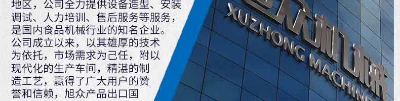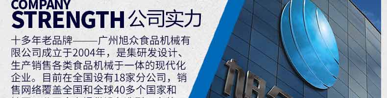 廣州旭眾食品機械有限公司是一家集科研開發(fā),生產(chǎn)設(shè)計,營銷服務(wù)為一體的現(xiàn)代化生產(chǎn)企業(yè)?,F(xiàn)代化生產(chǎn)車間,精湛制造技術(shù),所產(chǎn)機械歷經(jīng)市場重重考驗,不斷贏得海內(nèi)外客戶的贊譽。