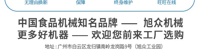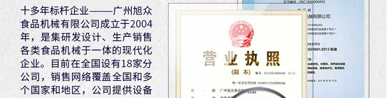 廣州旭眾食品機(jī)械有限公司是一家集科研開發(fā),生產(chǎn)設(shè)計,營銷服務(wù)為一體的現(xiàn)代化生產(chǎn)企業(yè)?,F(xiàn)代化生產(chǎn)車間,精湛制造技術(shù),所產(chǎn)機(jī)械歷經(jīng)市場重重考驗(yàn),不斷贏得海內(nèi)外客戶的贊譽(yù)。