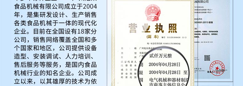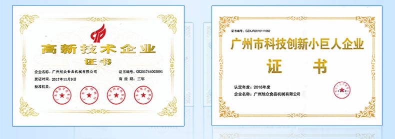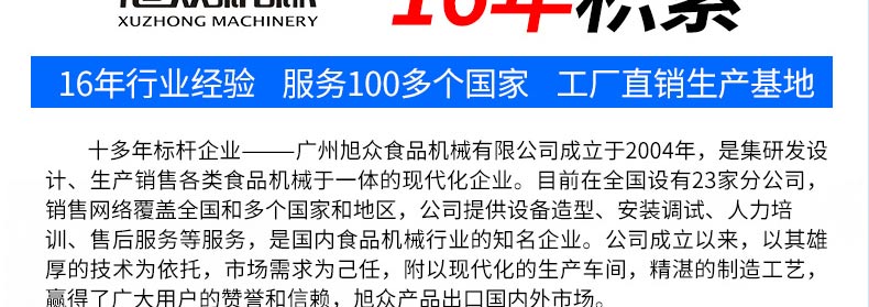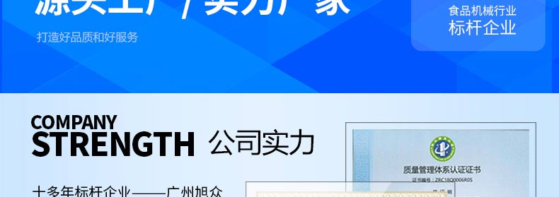 廣州旭眾食品機(jī)械有限公司是一家集科研開發(fā),生產(chǎn)設(shè)計,營銷服務(wù)為一體的現(xiàn)代化生產(chǎn)企業(yè)?,F(xiàn)代化生產(chǎn)車間,精湛制造技術(shù),所產(chǎn)機(jī)械歷經(jīng)市場重重考驗,不斷贏得海內(nèi)外客戶的贊譽(yù)。