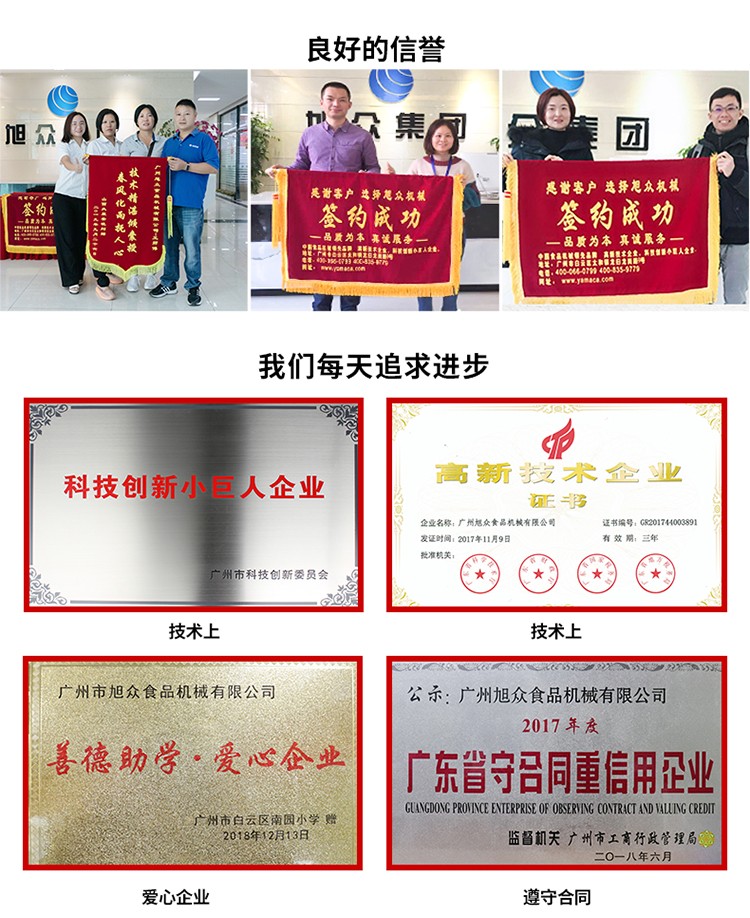 廣州旭眾食品機(jī)械有限公司是一家集科研開發(fā),生產(chǎn)設(shè)計(jì),營銷服務(wù)為一體的現(xiàn)代化生產(chǎn)企業(yè)。現(xiàn)代化生產(chǎn)車間,精湛制造技術(shù),所產(chǎn)機(jī)械歷經(jīng)市場重重考驗(yàn),不斷贏得海內(nèi)外客戶的贊譽(yù)。