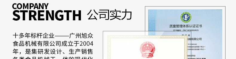 廣州旭眾食品機(jī)械有限公司是一家集科研開(kāi)發(fā),生產(chǎn)設(shè)計(jì),營(yíng)銷(xiāo)服務(wù)為一體的現(xiàn)代化生產(chǎn)企業(yè)?,F(xiàn)代化生產(chǎn)車(chē)間,精湛制造技術(shù),所產(chǎn)機(jī)械歷經(jīng)市場(chǎng)重重考驗(yàn),不斷贏得海內(nèi)外客戶的贊譽(yù)。
