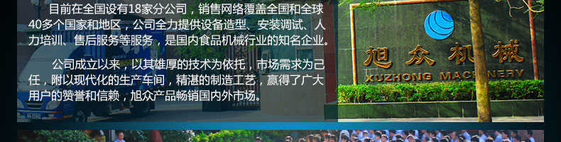 廣州旭眾食品機(jī)械有限公司是一家集科研開發(fā),生產(chǎn)設(shè)計(jì),營(yíng)銷服務(wù)為一體的現(xiàn)代化生產(chǎn)企業(yè)。現(xiàn)代化生產(chǎn)車間,精湛制造技術(shù),所產(chǎn)機(jī)械歷經(jīng)市場(chǎng)重重考驗(yàn),不斷贏得海內(nèi)外客戶的贊譽(yù)。