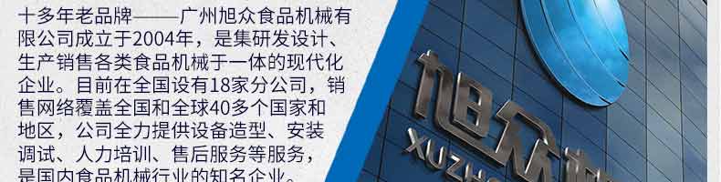 廣州旭眾食品機(jī)械有限公司是一家集科研開(kāi)發(fā),生產(chǎn)設(shè)計(jì),營(yíng)銷服務(wù)為一體的現(xiàn)代化生產(chǎn)企業(yè)?,F(xiàn)代化生產(chǎn)車間,精湛制造技術(shù),所產(chǎn)機(jī)械歷經(jīng)市場(chǎng)重重考驗(yàn),不斷贏得海內(nèi)外客戶的贊譽(yù)。