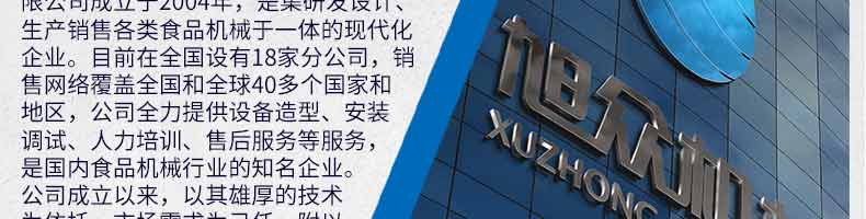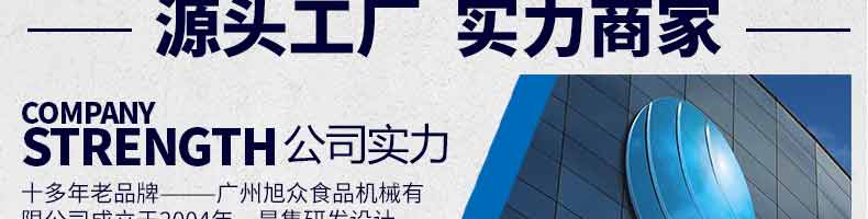 廣州旭眾食品機械有限公司是一家集科研開發(fā),生產(chǎn)設(shè)計,營銷服務(wù)為一體的現(xiàn)代化生產(chǎn)企業(yè)。現(xiàn)代化生產(chǎn)車間,精湛制造技術(shù),所產(chǎn)機械歷經(jīng)市場重重考驗,不斷贏得海內(nèi)外客戶的贊譽。