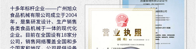 廣州旭眾食品機械有限公司是一家集科研開發(fā),生產(chǎn)設(shè)計,營銷服務(wù)為一體的現(xiàn)代化生產(chǎn)企業(yè)?,F(xiàn)代化生產(chǎn)車間,精湛制造技術(shù),所產(chǎn)機械歷經(jīng)市場重重考驗,不斷贏得海內(nèi)外客戶的贊譽。