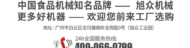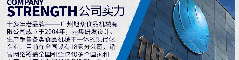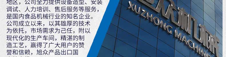 廣州旭眾食品機(jī)械有限公司是一家集科研開發(fā),生產(chǎn)設(shè)計,營銷服務(wù)為一體的現(xiàn)代化生產(chǎn)企業(yè)?,F(xiàn)代化生產(chǎn)車間,精湛制造技術(shù),所產(chǎn)機(jī)械歷經(jīng)市場重重考驗,不斷贏得海內(nèi)外客戶的贊譽(yù)。