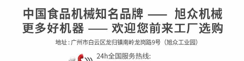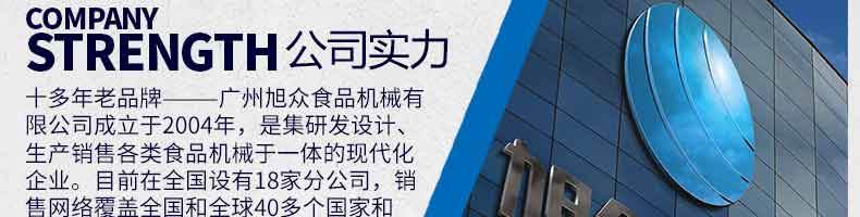 廣州旭眾食品機械有限公司是一家集科研開發(fā),生產(chǎn)設計,營銷服務為一體的現(xiàn)代化生產(chǎn)企業(yè)?,F(xiàn)代化生產(chǎn)車間,精湛制造技術,所產(chǎn)機械歷經(jīng)市場重重考驗,不斷贏得海內(nèi)外客戶的贊譽。