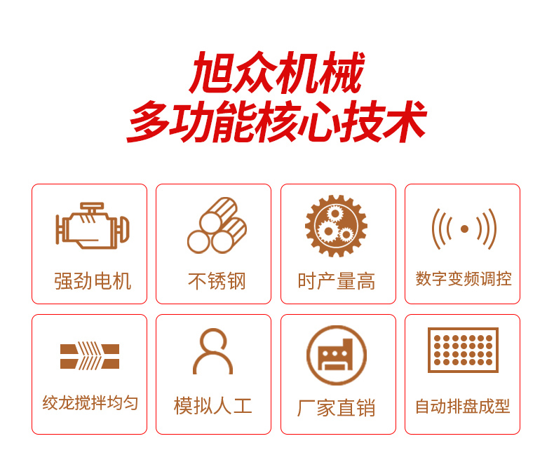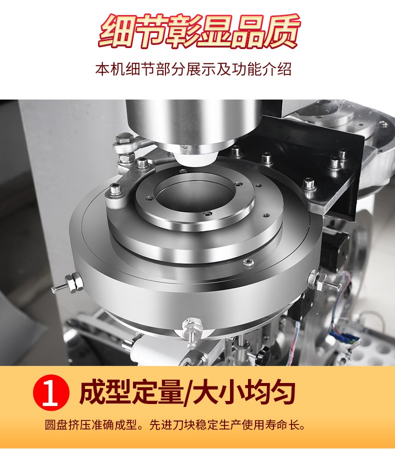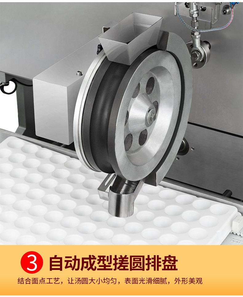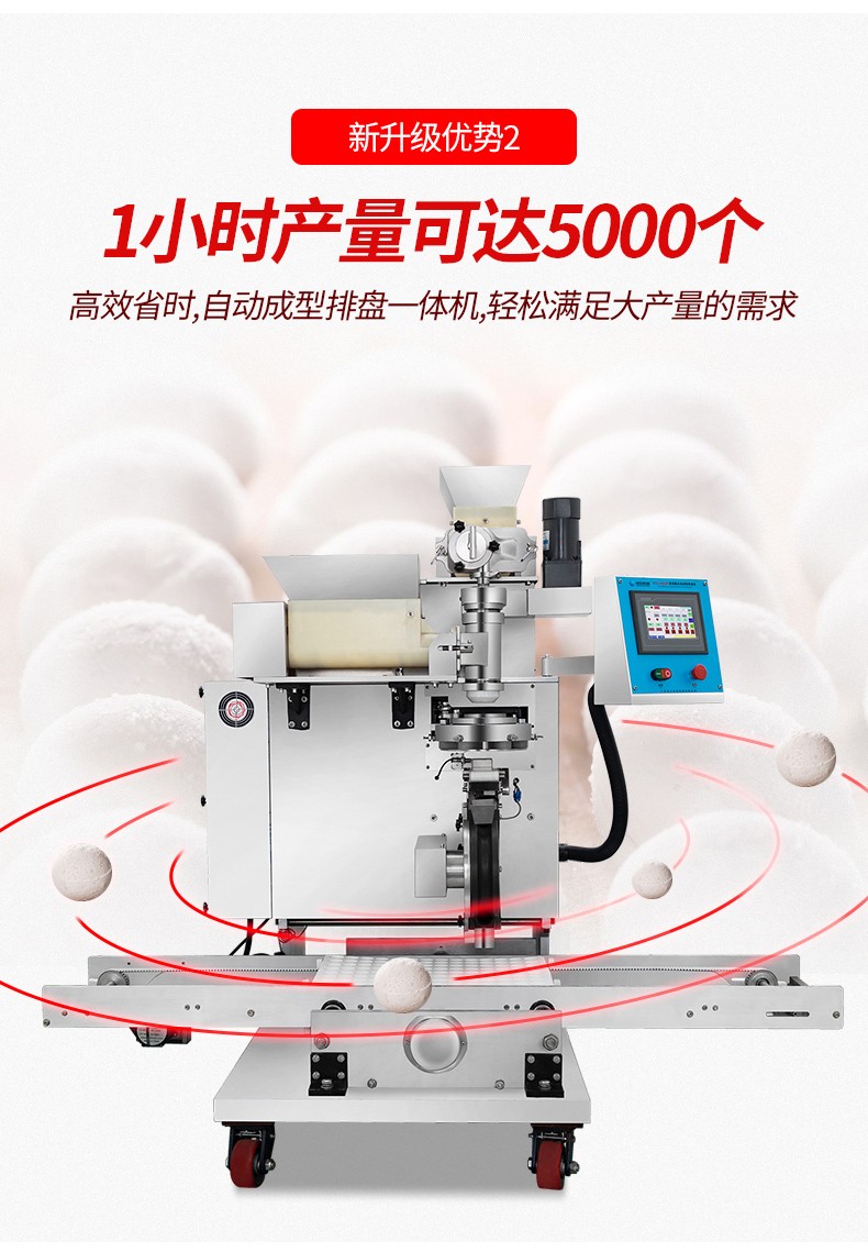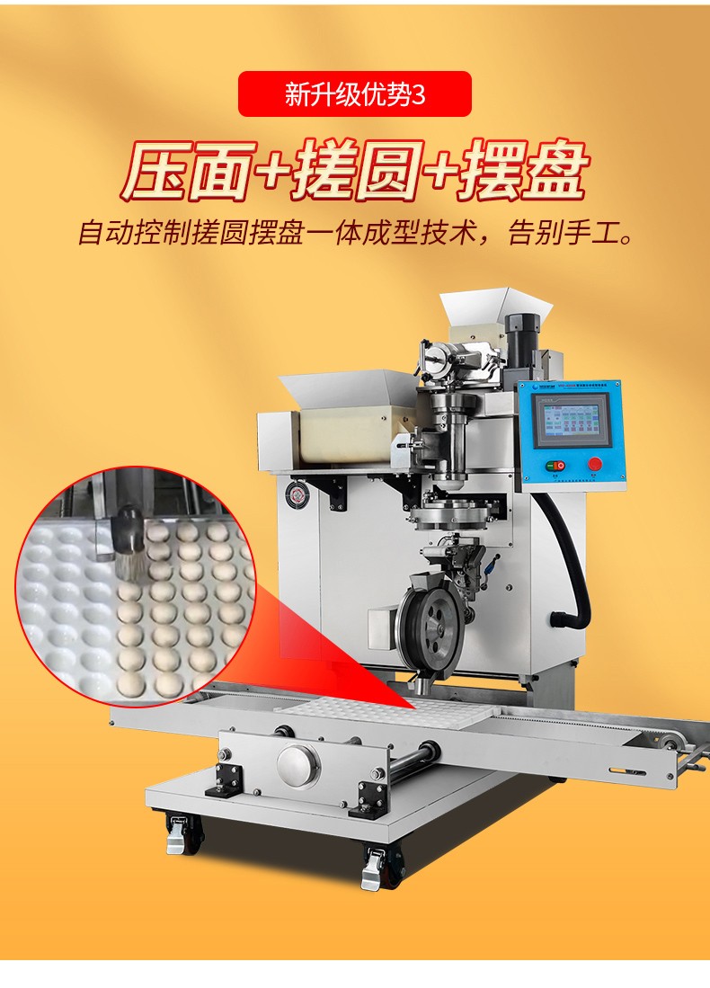 ◆觸摸屏自動(dòng)控制搓圓擺盤一體成型技術(shù),使得制品外形美觀,大小均勻,表面光亮細(xì)膩、口感柔滑,彈韌性佳。