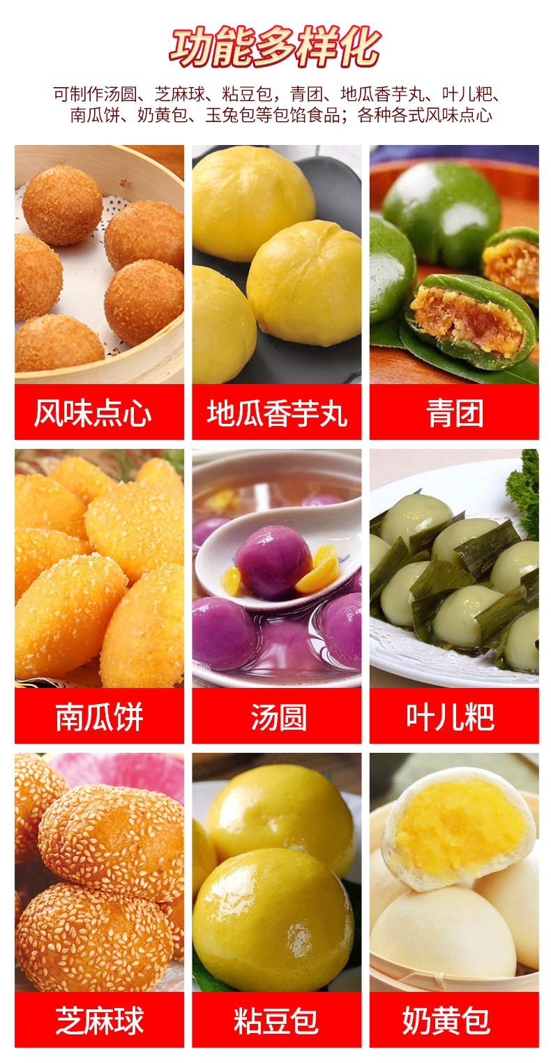 可依外皮及餡料的種類不同,可制作湯圓,芝麻球,豆沙包,南瓜餅、奶皇包、含餡饅頭、玉兔包等包餡食品;各種地方風(fēng)味小吃及各式點(diǎn)心。如:東北的粘豆包,江浙滬的青團(tuán),東南部的地瓜丸,香芋丸;西南的葉兒粑等等。