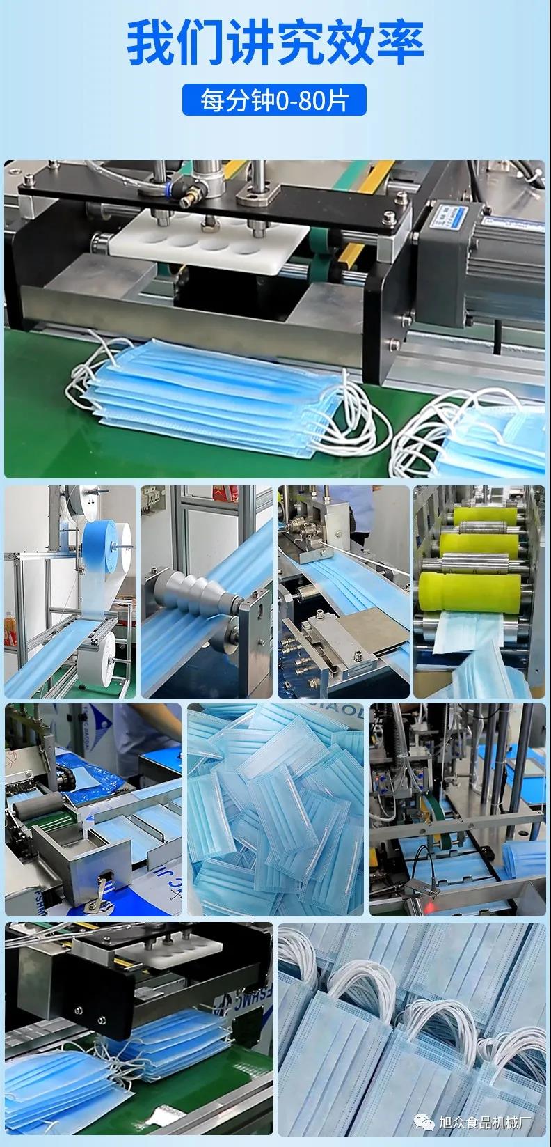 旭眾牌一拖二口罩機(jī)由一臺(tái)本體機(jī)帶動(dòng)兩臺(tái)耳帶機(jī)組成。本體機(jī)輸出ロ罩本體后,由輸送帶結(jié)構(gòu)將口罩本體片輸送到連接耳帶機(jī)的輸送帶上,再通過輸送帶將口罩片輸送到耳帶機(jī)的正面第一個(gè)口罩盤上方,最后通過氣缸下壓把口罩片放置到耳帶機(jī)的口罩盤內(nèi),后續(xù)由耳帶機(jī)完成口罩的耳帶熔接,包邊等動(dòng)作,從而完成一個(gè)耳帶口罩產(chǎn)品的生產(chǎn)。本機(jī)采用PLC、觸摸屏控制、主傳送帶采用單相馬達(dá)輸送、步進(jìn)馬達(dá)翻轉(zhuǎn),傳動(dòng)精確,控制穩(wěn)定,速度可調(diào)。