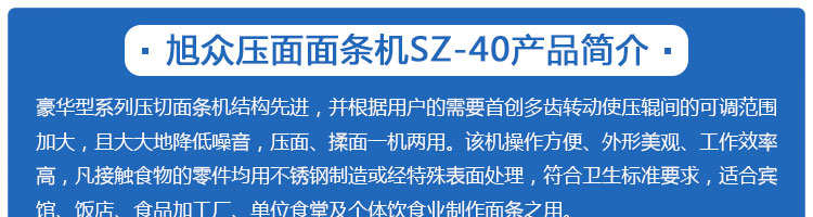 SZ40、SZ60壓面面條機(jī)系列,本機(jī)壓面、揉面一機(jī)兩用,用于制作面條、云吞皮、糕點(diǎn)、面點(diǎn)等食品,生產(chǎn)的產(chǎn)品韌性大、耐煮、不易斷,適合于賓館、飯店、食堂、面包廠及各類面點(diǎn)加工單位或個(gè)體商戶使用。