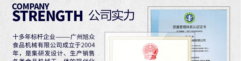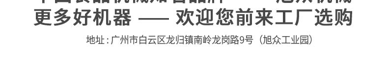廣州旭眾食品機(jī)械有限公司是一家集科研開發(fā),生產(chǎn)設(shè)計,營銷服務(wù)為一體的現(xiàn)代化生產(chǎn)企業(yè)?,F(xiàn)代化生產(chǎn)車間,精湛制造技術(shù),所產(chǎn)機(jī)械歷經(jīng)市場重重考驗,不斷贏得海內(nèi)外客戶的贊譽(yù)。