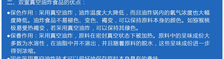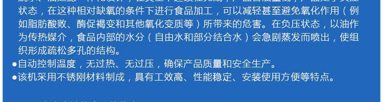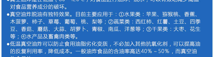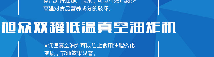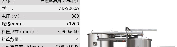 zk-1200雙罐低溫真空油炸機(jī),適用于水果類(lèi)、蔬菜類(lèi)、干果類(lèi)、水產(chǎn)品機(jī)畜禽肉類(lèi)等。油炸食品不易褪色、褐色,可以保持原料本身的顏色